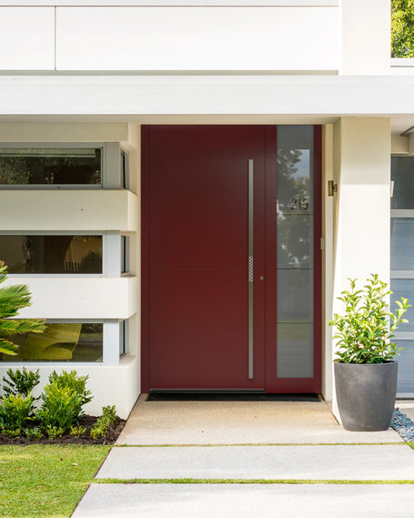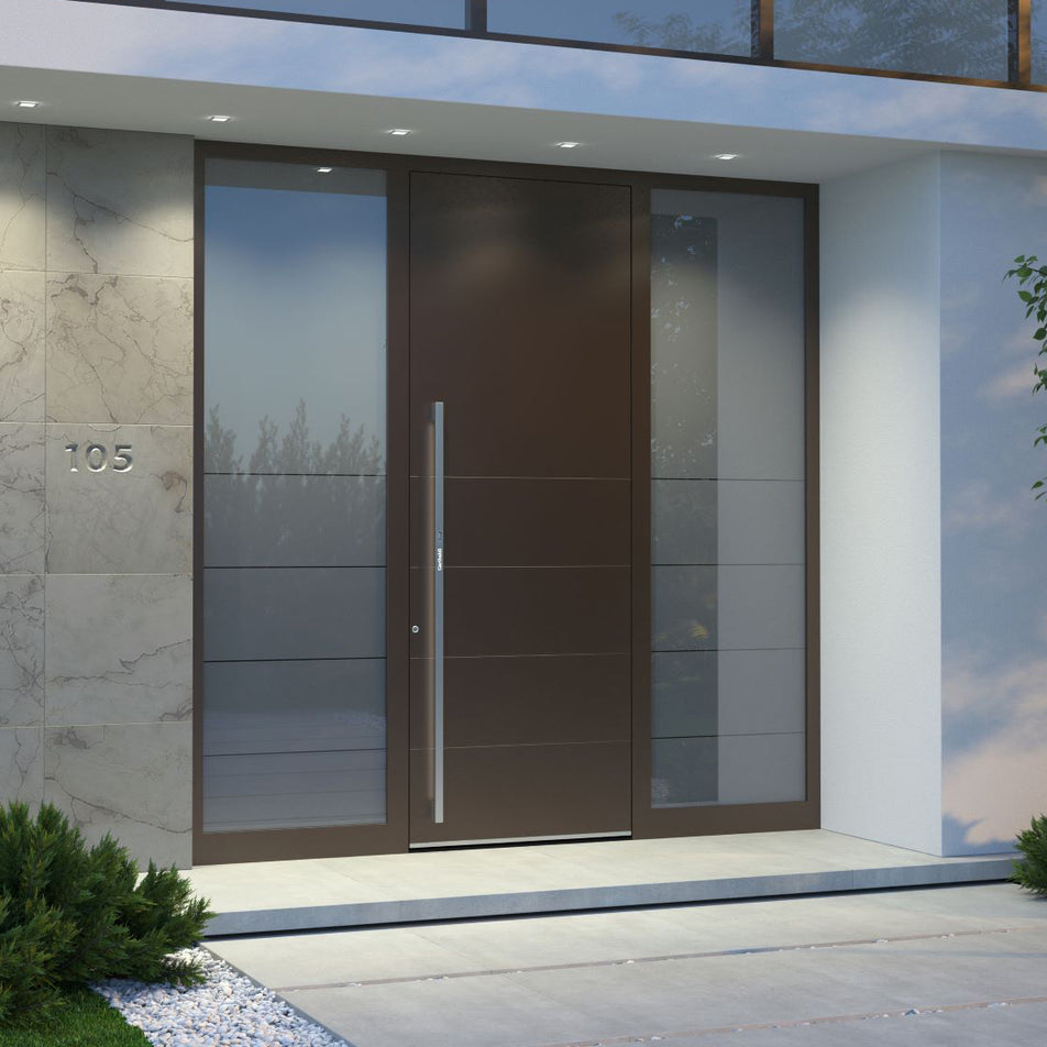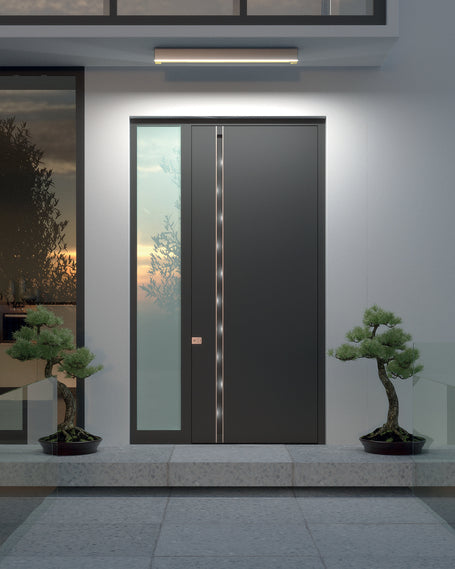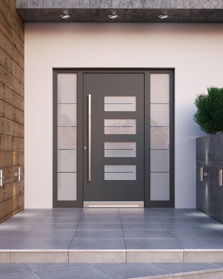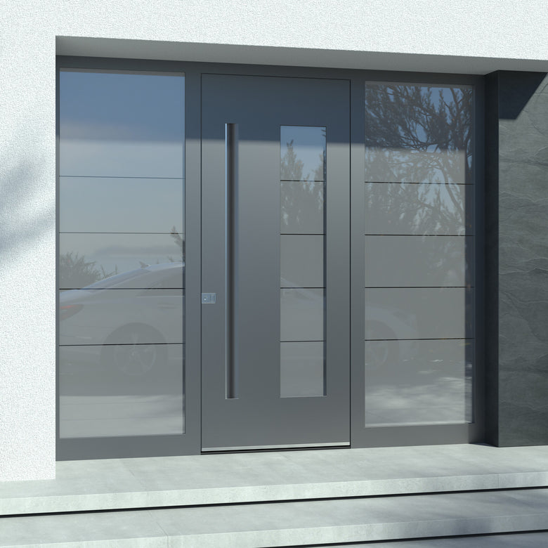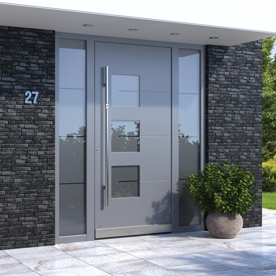 Unsere Aluminium-Haustüren mit Seitenteil bieten ein stilvolles Design, mehr Licht und einladende Eleganz für Ihren Eingangsbereich.